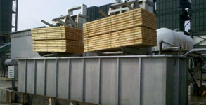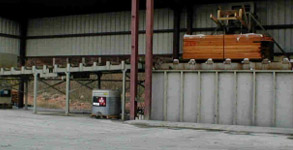 Pallet Dip tanks with stainless tilt carriage, clamp down and optional 14 foot out-feed deck for assembled pallets, or pallet Cut Stock dip tanks with multiple hoists.