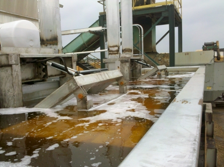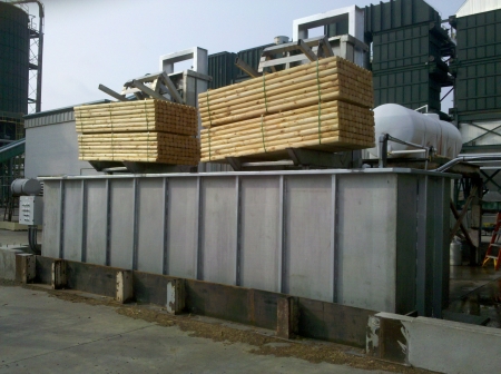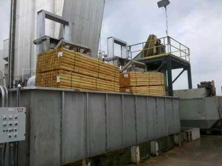 This dip tank was purchased to primarily dip landscape timbers. Front view of dip tank with both hoist/carriages loaded with double packs of land scape timbers. |